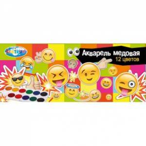 Главная > Канцтовары > Детская канцелярия > Краски, гуаши, стаканы, палитра > Акварель медовая 12 цветов., "Смайлы" без кисточки, картонная коробка