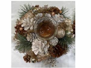Главная > Новогодние товары > Хвойная продукция > Веночки украшенные > Венок-подсвечник, d-15 см. (золото)